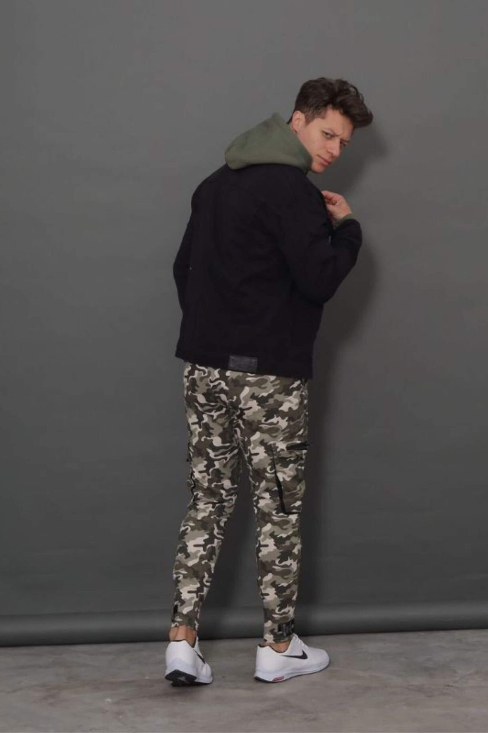 Calça camuflada cargo modelo com bolsos laterais fechamento